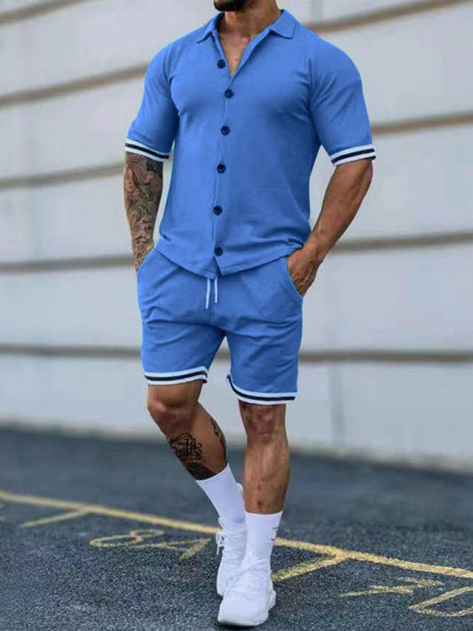 Men's color contrast lapel short-sleeved shirt + shorts two-piece suit