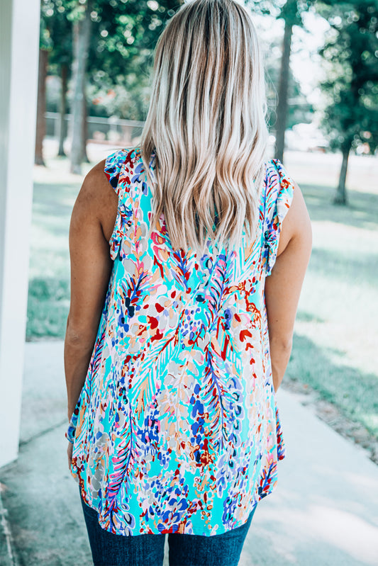 Light Blue Abstract Print Color Block Babydoll Boho Sleeveless Shirt with Ruffle