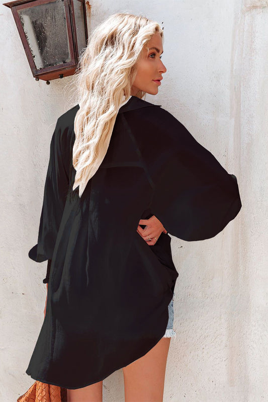 Pocket Smocked Cuffs Bishop Sleeve Shirt