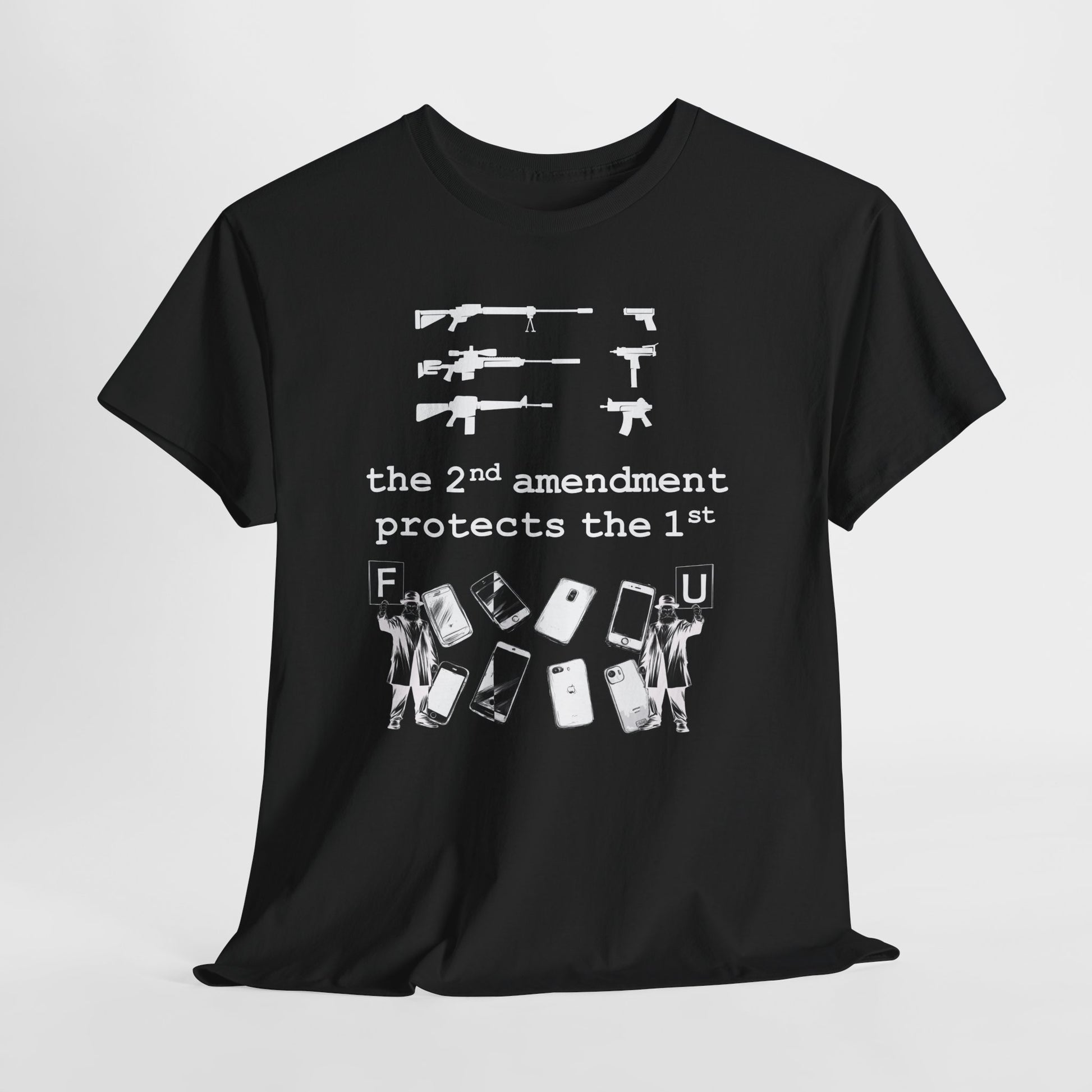 This bold tee speaks with quiet confidence. A structured, mid-weight cotton lays flat and steady, letting the high-contrast print take center stage: lines of firearms above a sharp, declarative message and a collage of cards and cash below. It reads like something carried from rallies and range days to late-night conversations — an outspoken piece for someone who wants their stance visible without shouting. The fabric feels sturdy against the skin and wears in, not out; the crew neckline holds its shape through washes. Wear it layered under a jacket on cool mornings, or alone when you want your message front and center. The overall mood is unapologetic, direct, and a little worn-in — the kind of shirt that becomes part of how someone shows up.