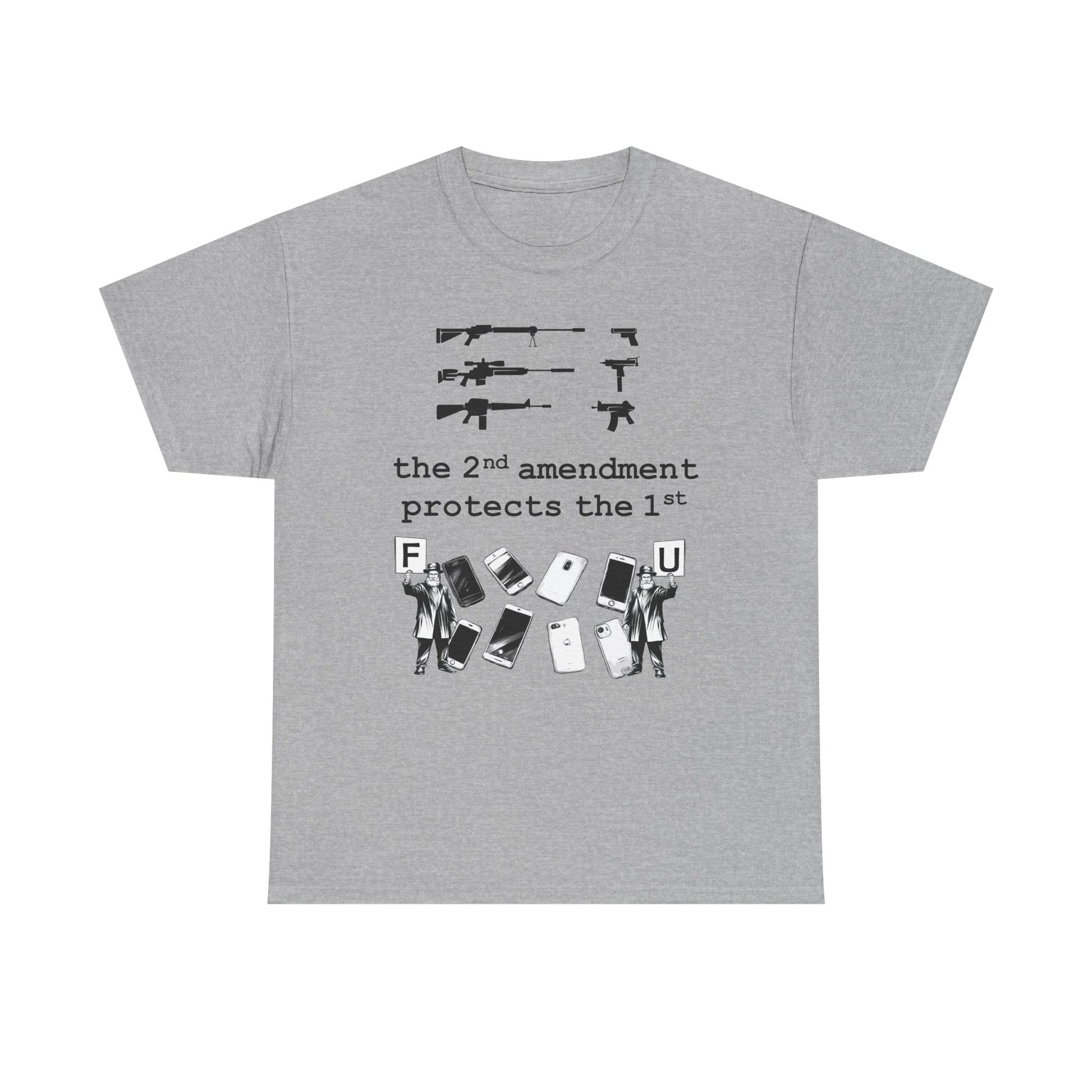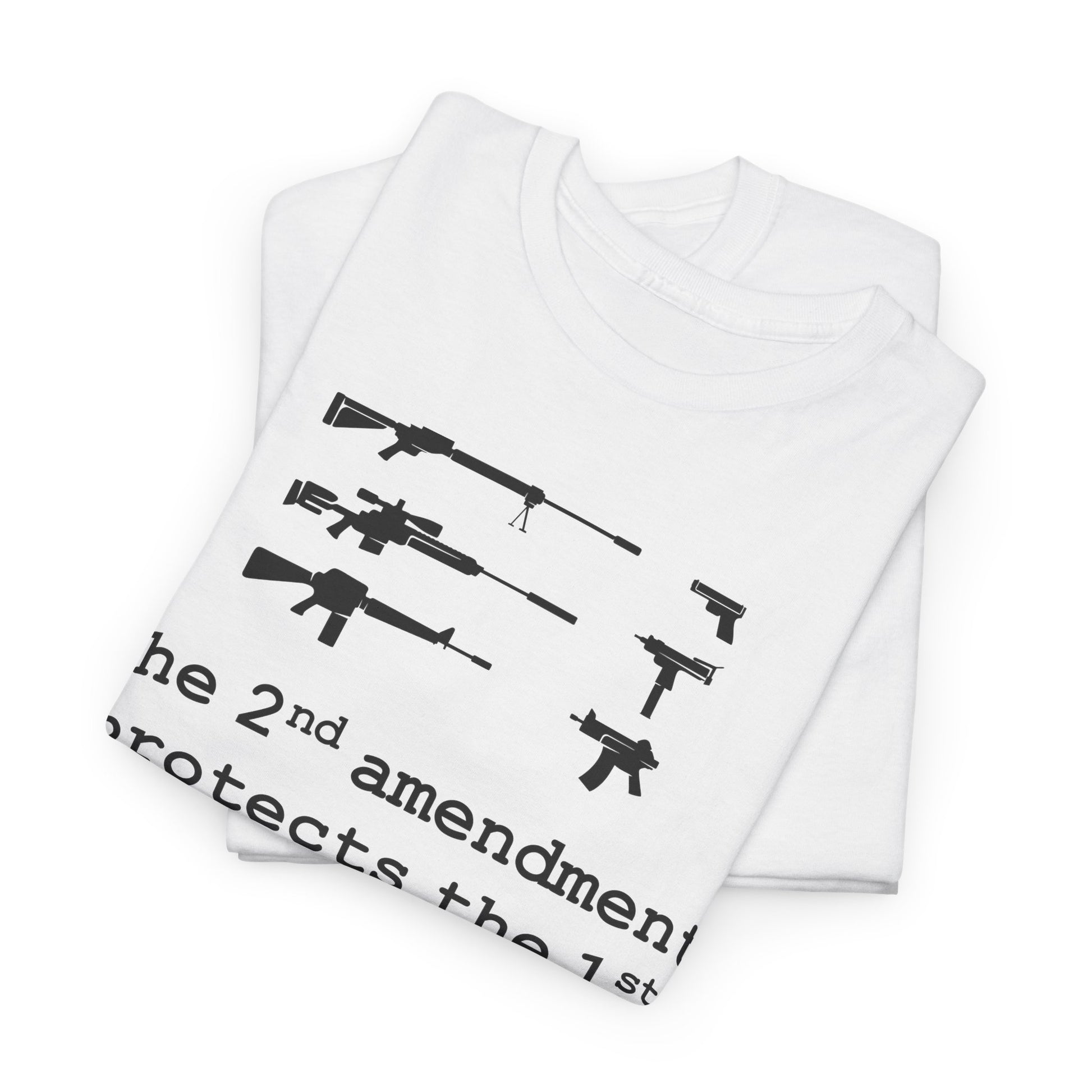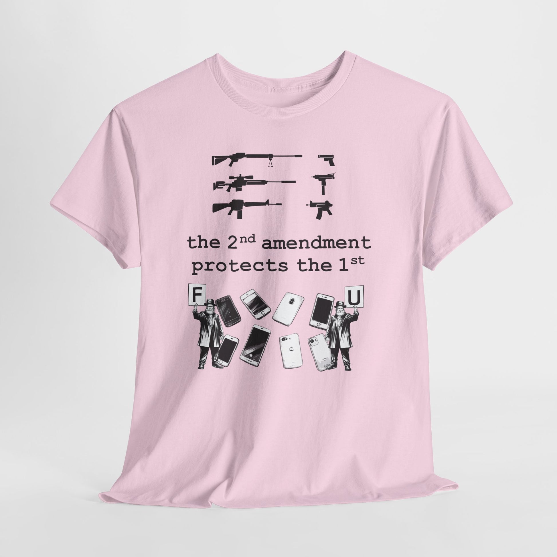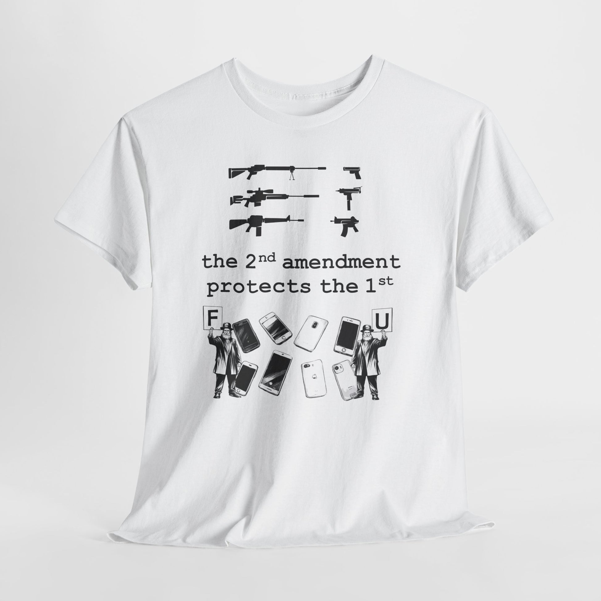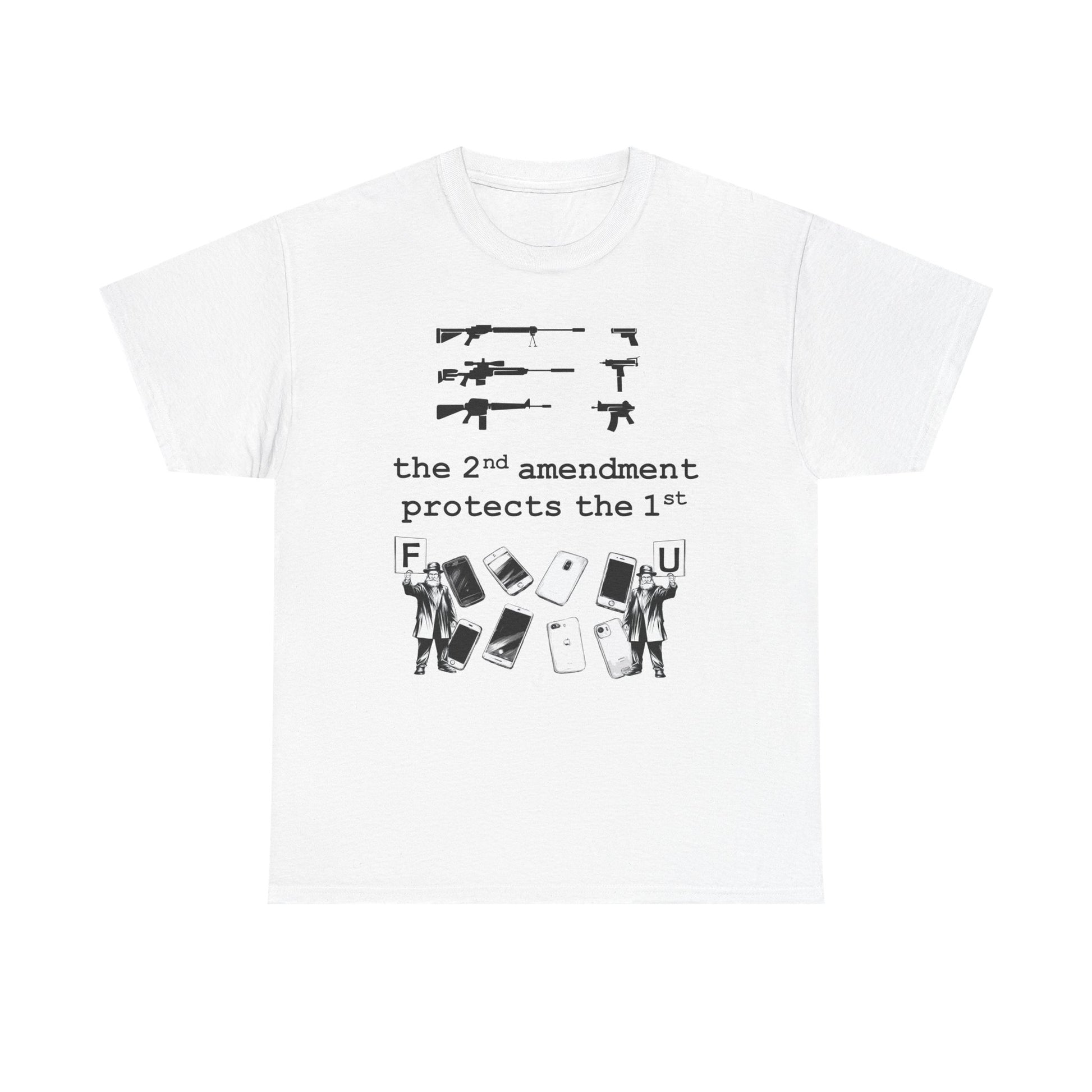 A bold, conversation-starting tee that wears like an everyday staple. This classic crew shirt carries a stark black-and-white graphic that contrasts weapons silhouettes above a clear, provocative slogan. The image feels raw and unapologetic — made to be worn by someone who wants their viewpoint visible without frills. The medium-weight cotton holds print detail well and the tear-away label keeps wear comfortable. Layer it under a jacket, wear it to a rally, or keep it for loud days when silence isn’t an option.