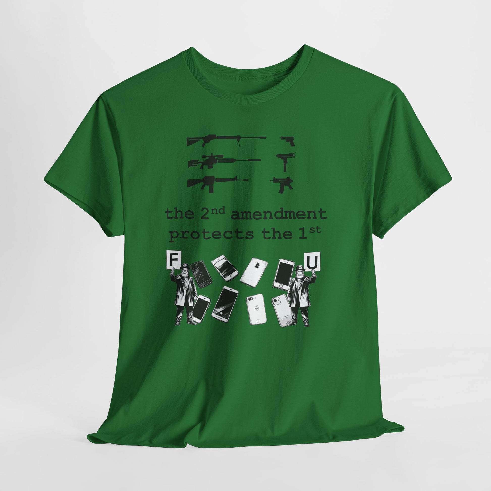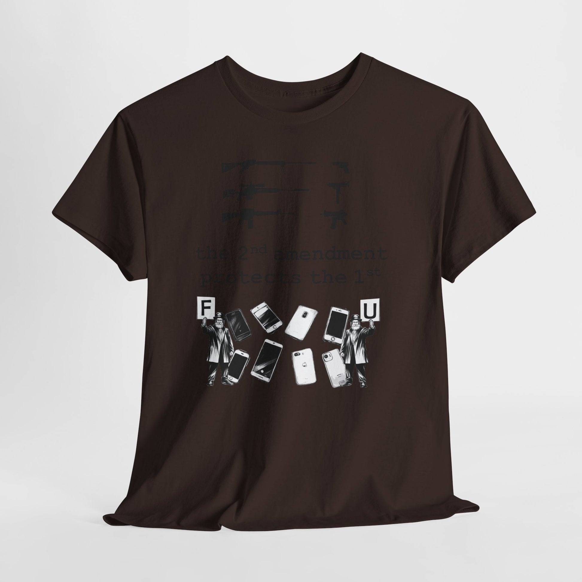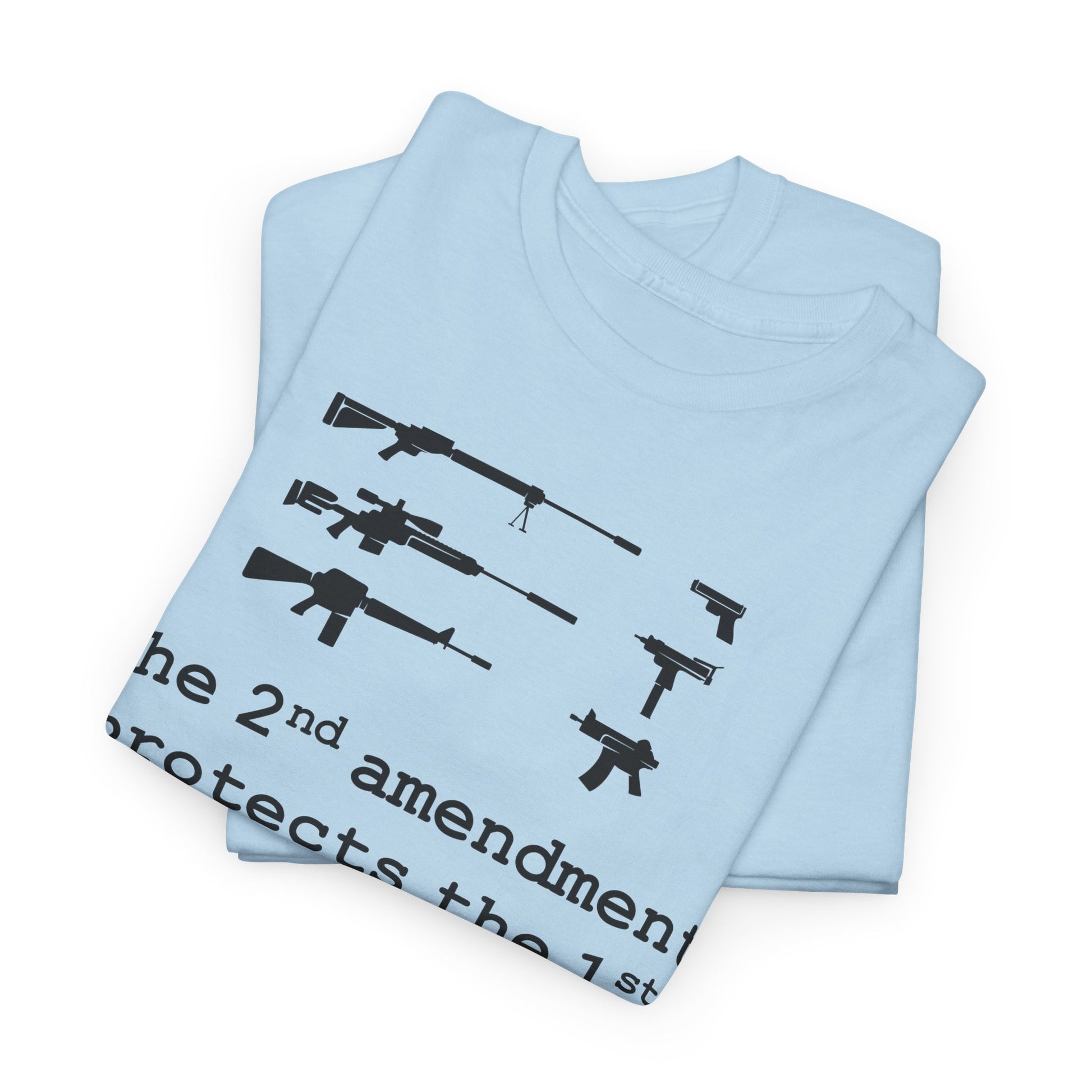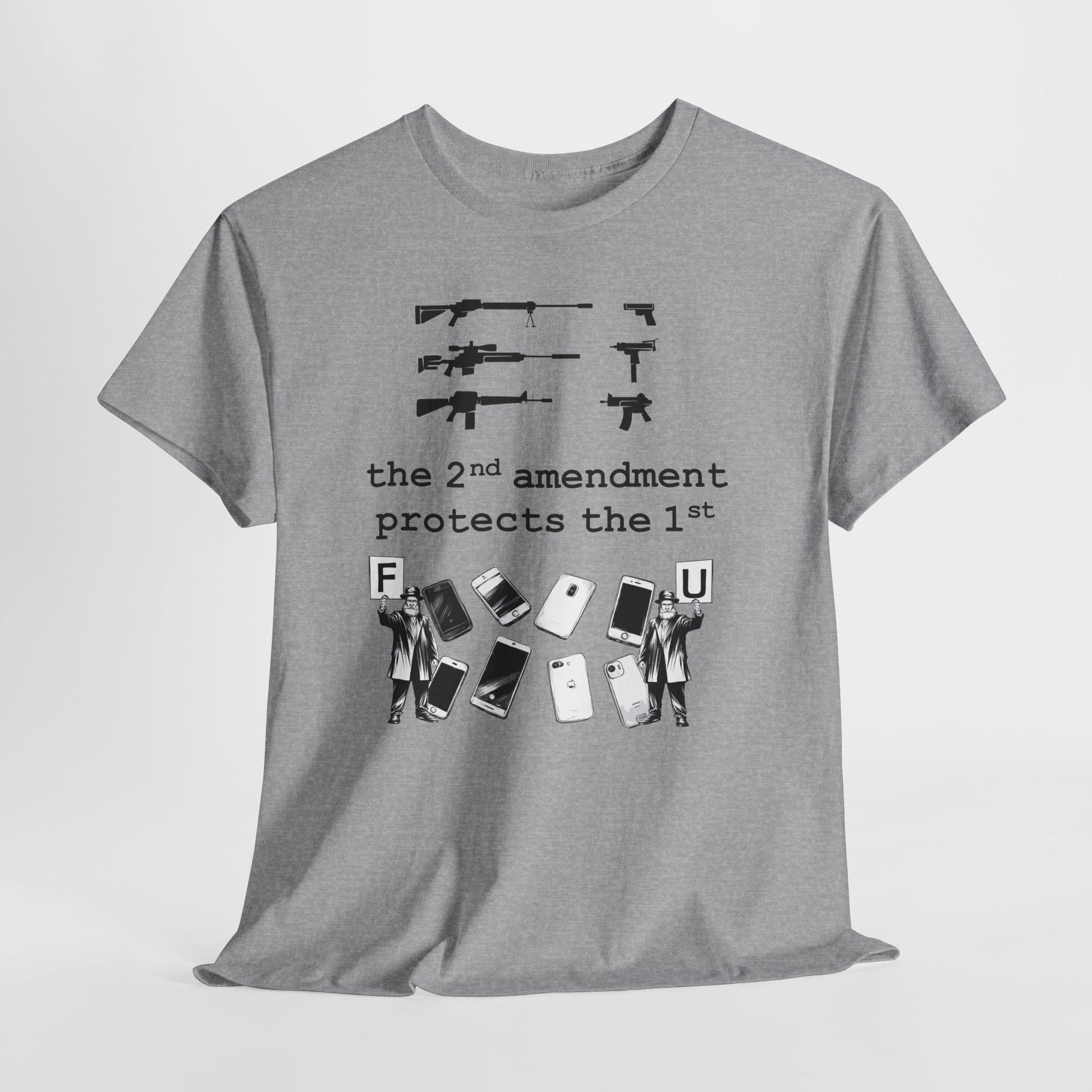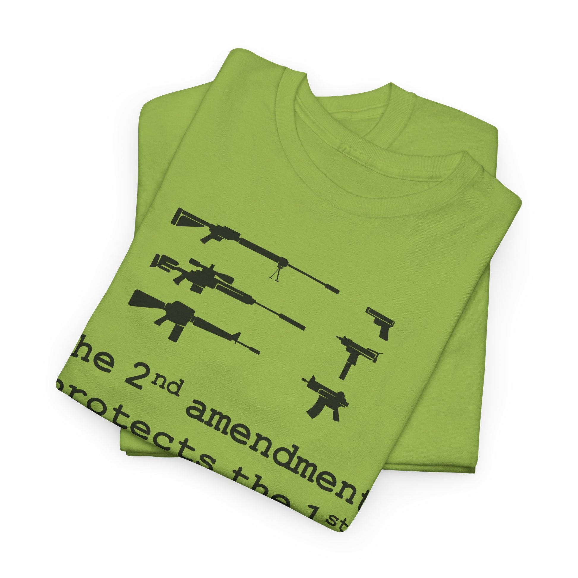 A bold, conversation-starting tee that wears like an everyday staple. This classic crew shirt carries a stark black-and-white graphic that contrasts weapons silhouettes above a clear, provocative slogan. The image feels raw and unapologetic — made to be worn by someone who wants their viewpoint visible without frills. The medium-weight cotton holds print detail well and the tear-away label keeps wear comfortable. Layer it under a jacket, wear it to a rally, or keep it for loud days when silence isn’t an option.