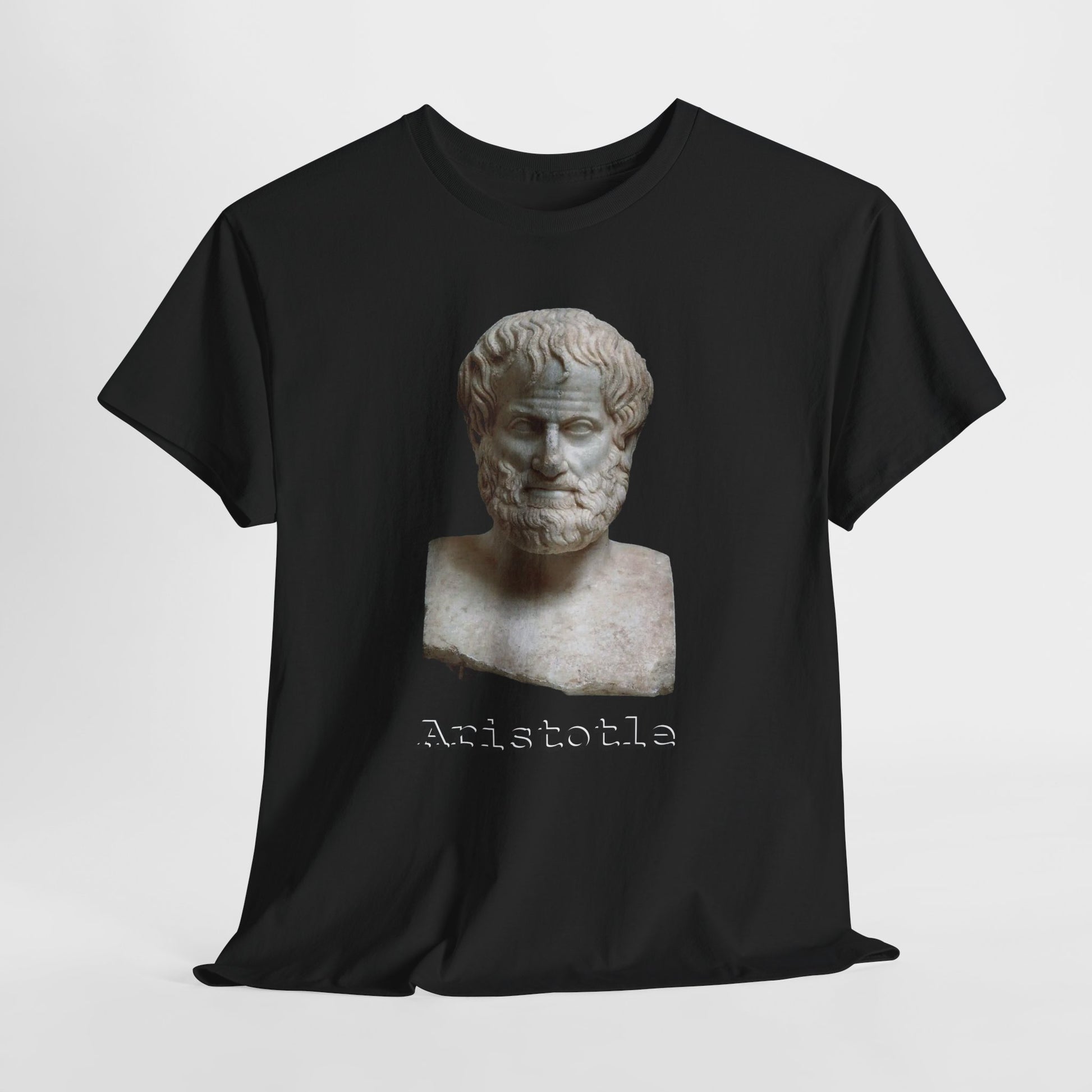 Wear a piece of classical thought with quiet confidence. This relaxed-fit cotton tee centers a sculpted bust of Aristotle over a subtle distressed nameplate, arranging ancient calm against a modern black canvas. It settles into your everyday wardrobe—layered under a jacket, paired with jeans, or left alone as a statement of studied taste. The soft-medium weight fabric and ribbed collar keep the shape long after repeated washes, while the tear-away label eliminates neck irritation. For lovers of philosophy, history students, or anyone who prefers thoughtful graphics over loud slogans, this shirt feels like a deliberate, wearable reminder to slow down and think.