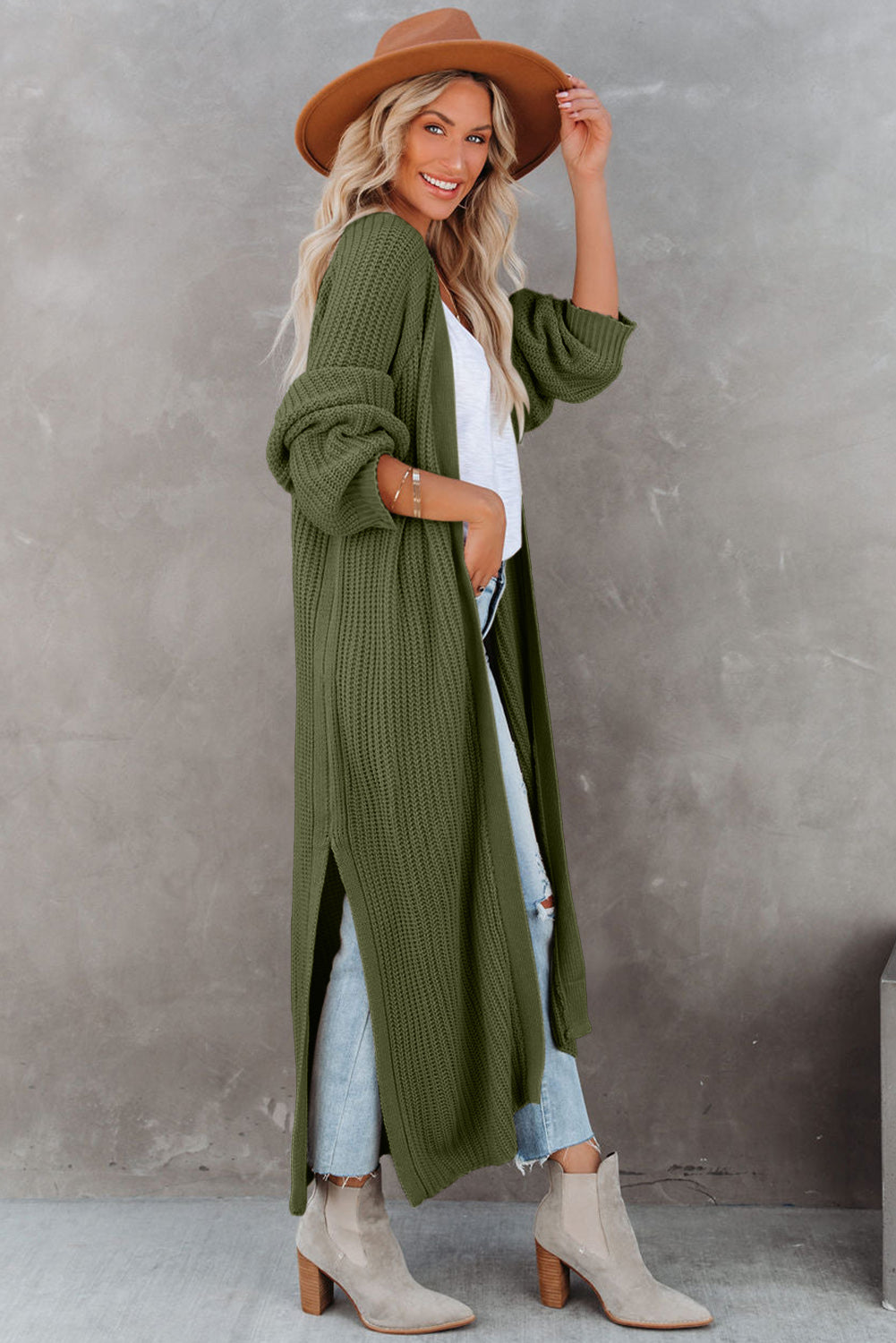 - The Beige Cable Knit Side Slits Open Front Duster Cardigan showcases a warm and neutral beige color that adds a touch of elegance and versatility to any outfit.