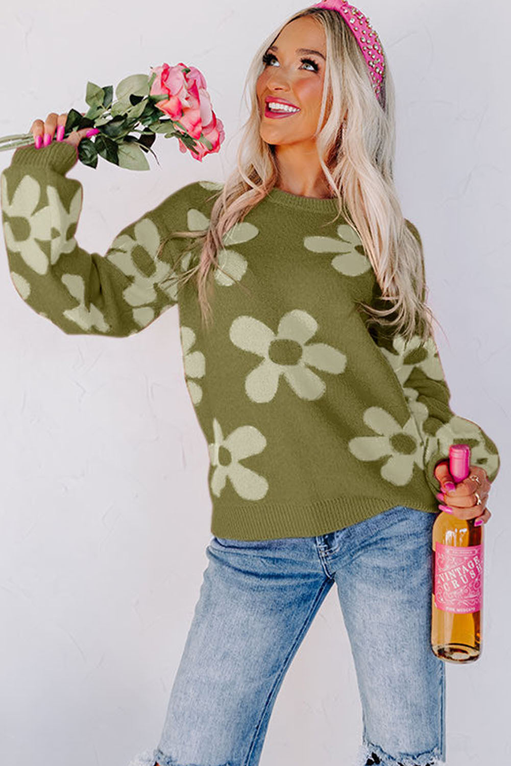 Floral Print Knitted Long Sleeve Pullover Sweater