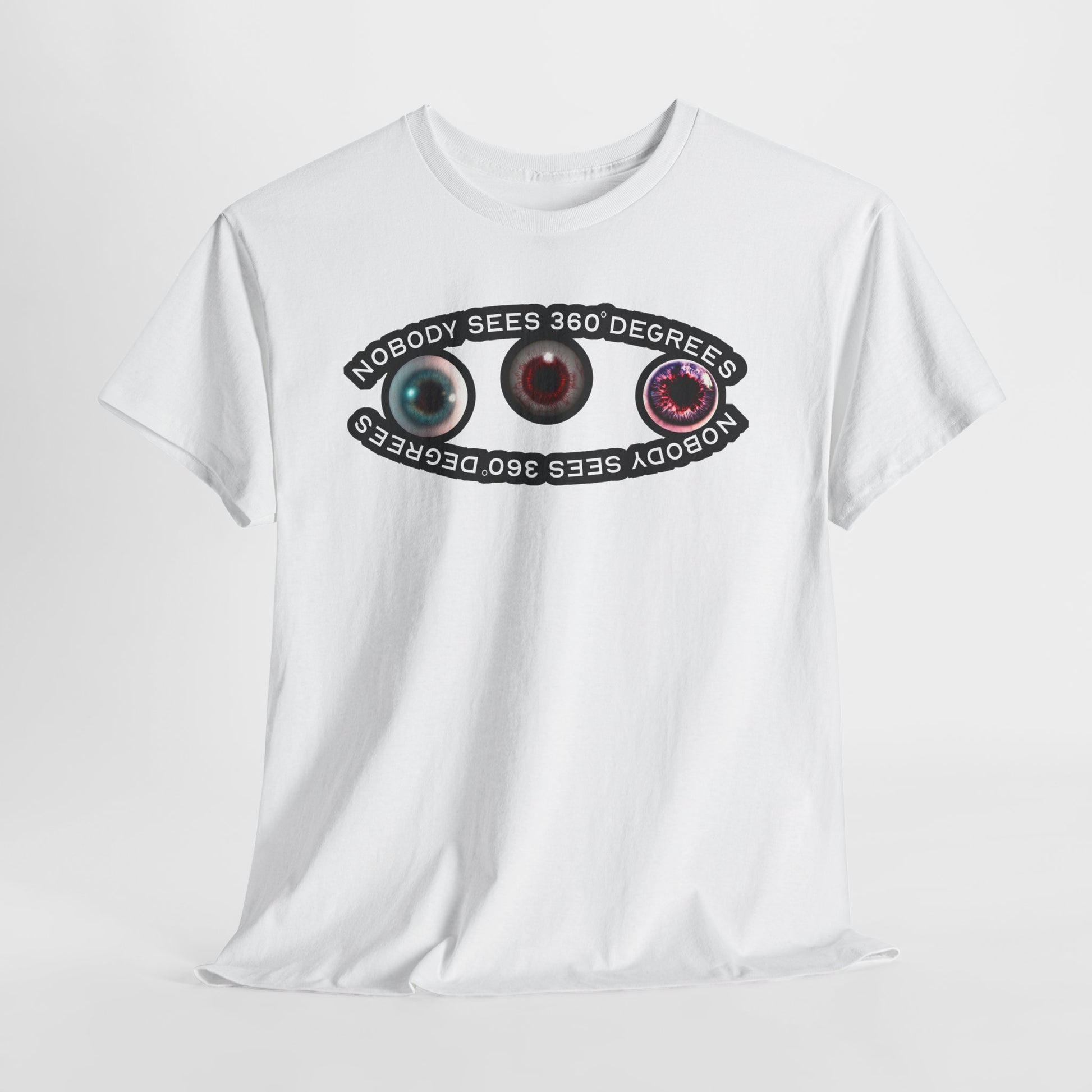 A soft, sturdy cotton tee that carries a hint of mischief. Centered on the chest are three stylized eyes framed by an oval ring of text reading “NOBODY SEES 360 DEGREES,” a small, clever design that feels like a private joke with the wearer. The classic crew neck and relaxed fit drape easily over layers or stand alone on warm days. This shirt settles into everyday life—for late-night city walks, music shows, or coffee runs—while the graphic sparks sideways smiles and quiet double-takes. The feel is familiar and dependable, the art a little uncanny and quietly confident: wear it when you want to look comfortable but pointedly aware.
