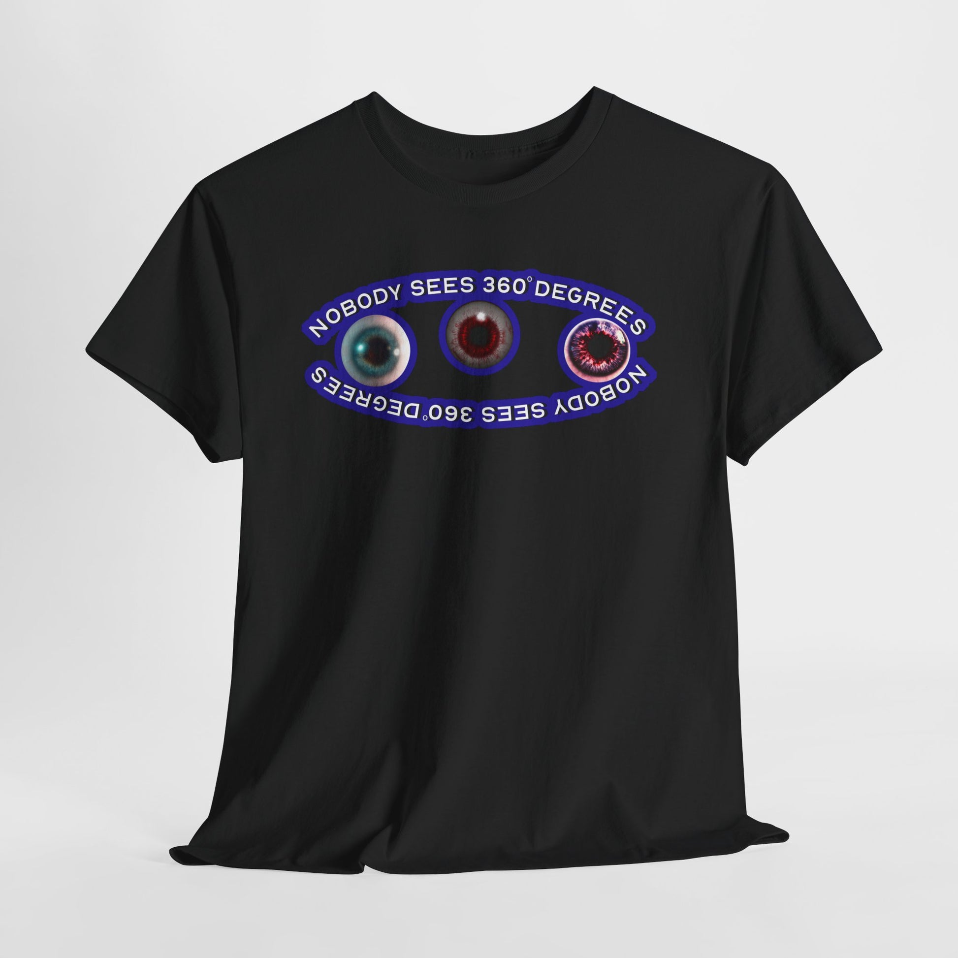 A bold, conversation-starting tee that channels late-night curiosity and playful paranoia. Centered on three stylized eyes and the looping phrase “NOBODY SEES 360° DEGREES,” the design sits low on the chest in neon blues and warm amber pupils. The shirt feels grounded and wearable — a relaxed crew neck silhouette made for wandering the city, heading to shows, or staying up with friends debating odd theories. It’s for people who enjoy irony, retro-futurist graphics, and apparel that hints at mischief without shouting. Wear it with a worn denim jacket and black boots, or let it peek out beneath an open flannel during a coffee-fueled meetup. The vibe is equal parts late-night diner and underground zine: curious, slightly defiant, and quietly in on the joke.