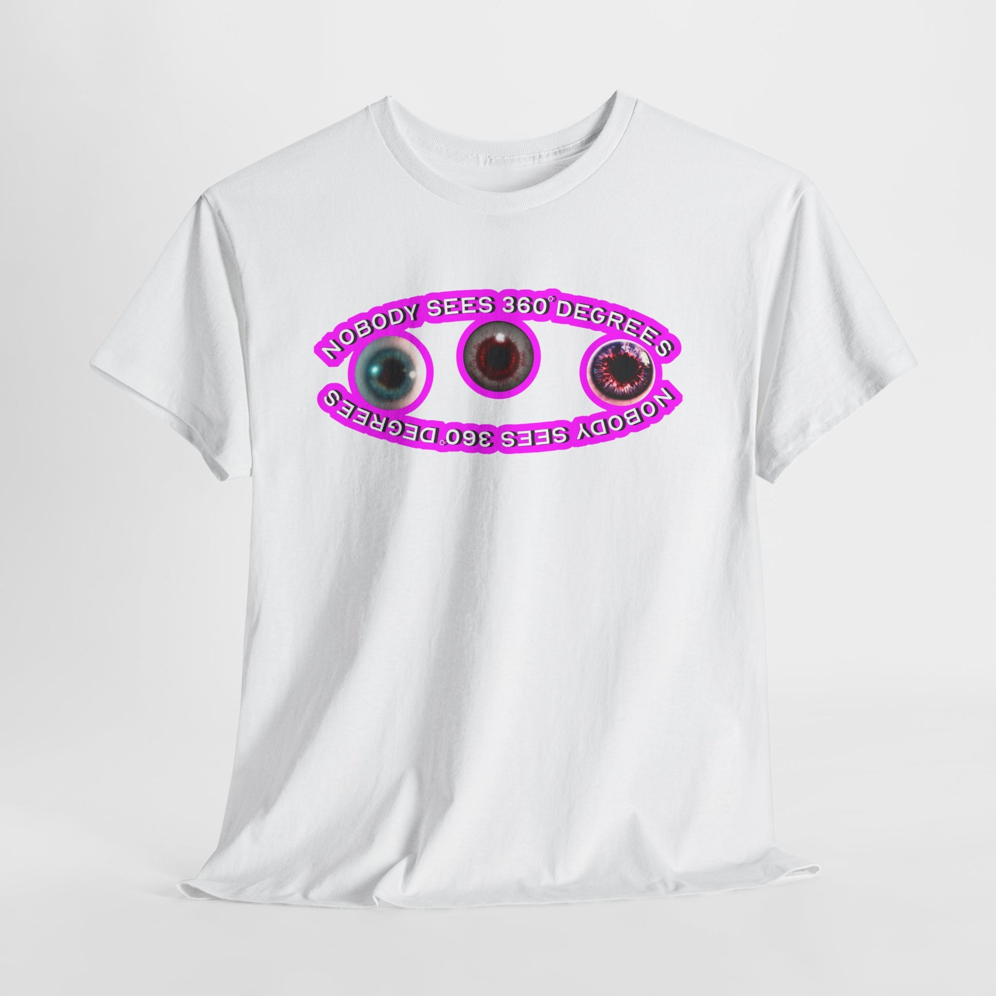 A soft, breathable tee printed with a playful, slightly surreal eye motif that reads “Nobody Sees 360 Degrees.” The simple white canvas lets the neon-pink oval and three glossy eyes stand out, creating a bold streetwear vibe with a wink of mystery. It wears relaxed and comfortable — a relaxed crew neckline and tubular knit body that sits easily through the shoulders and chest. Wear it when you want to provoke conversation, lean into alternative style, or add a bright, tongue-in-cheek statement to a quiet outfit.