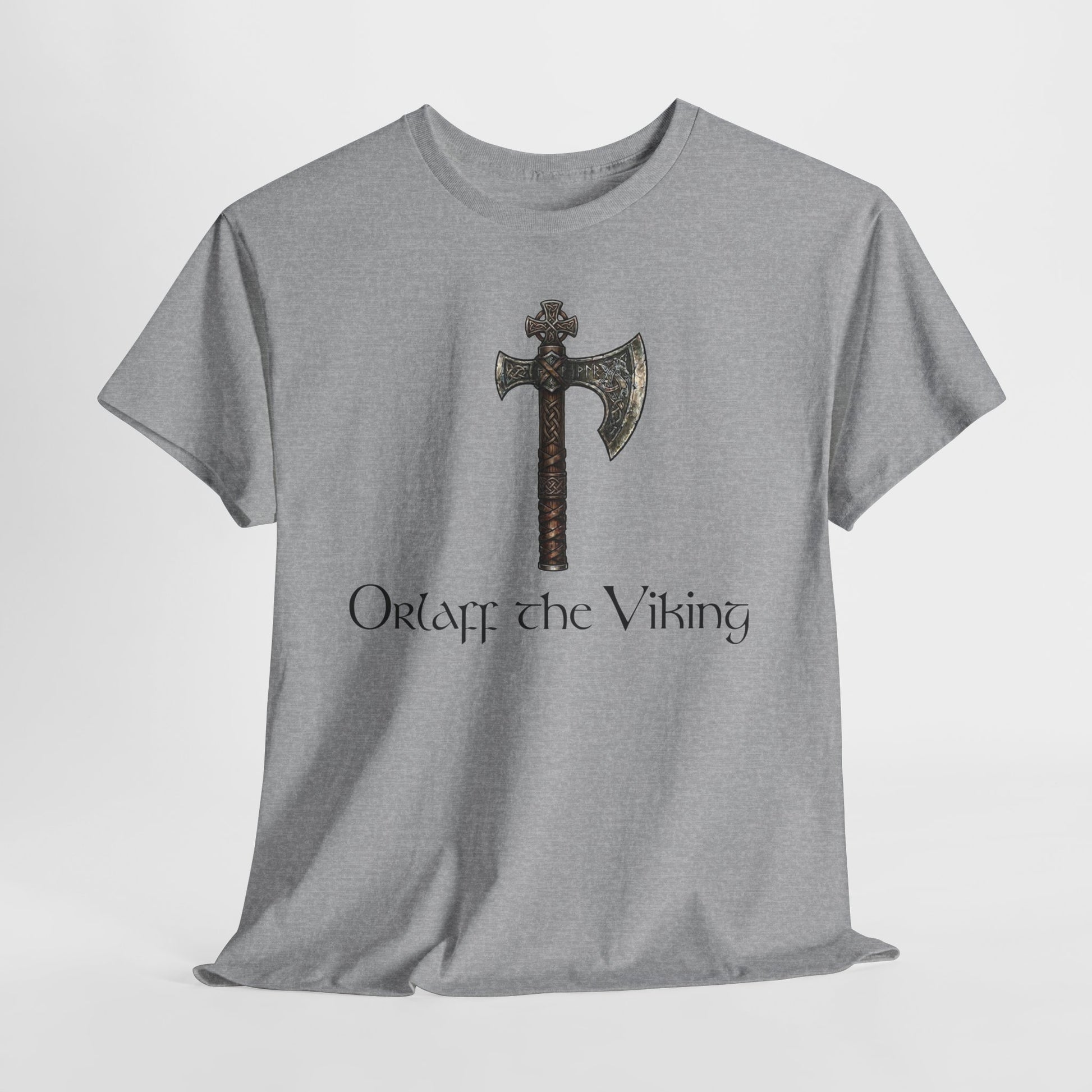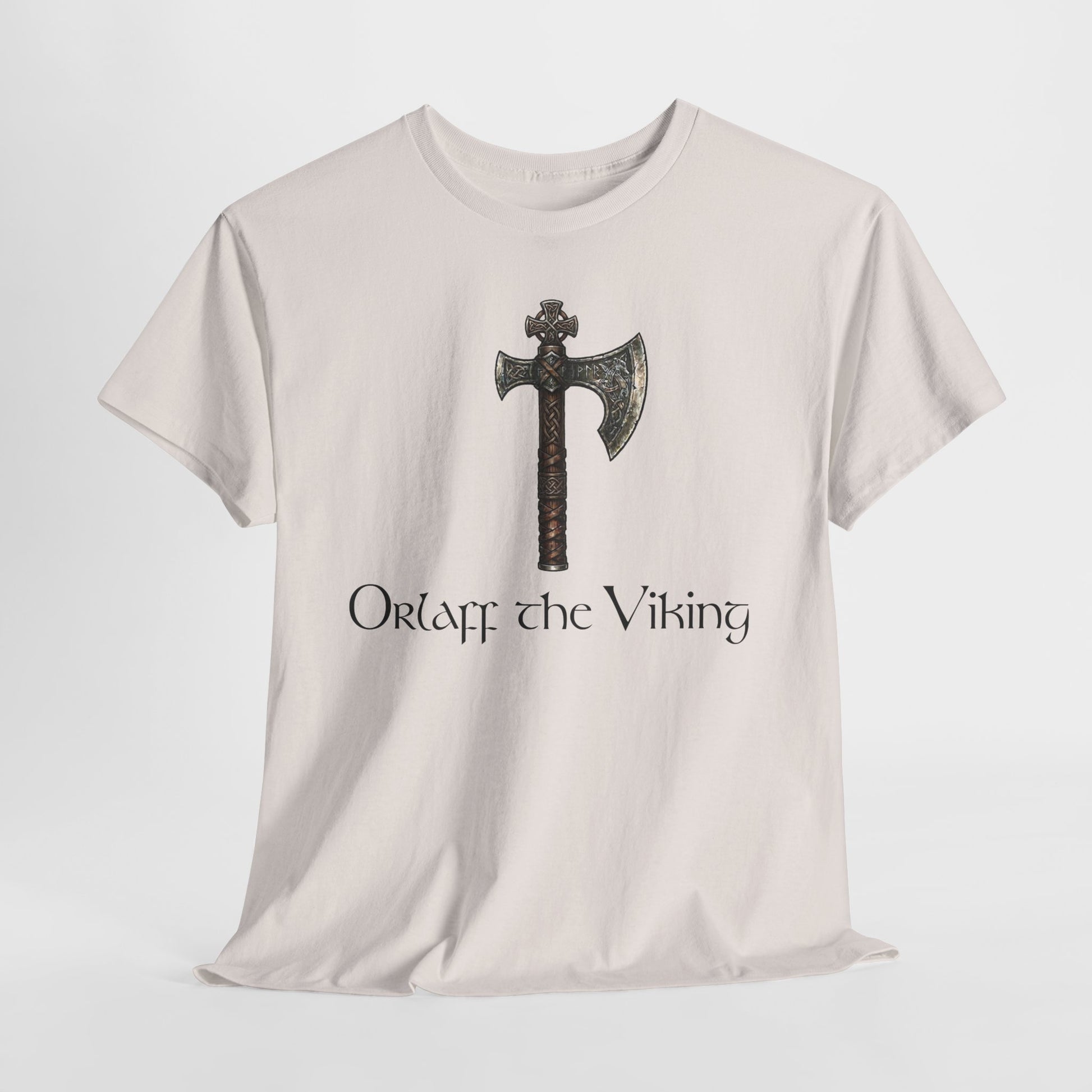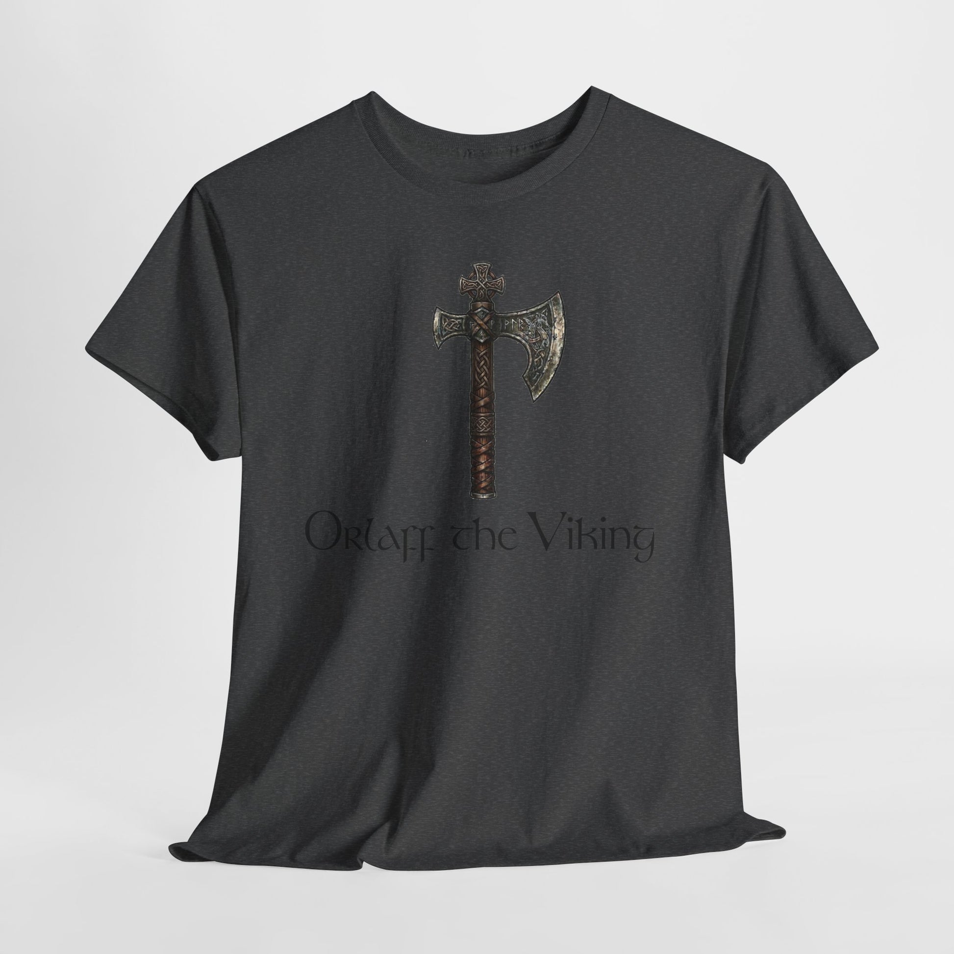 Wear a story of northern craft and quiet strength. This classic crew tee carries a weathered Viking axe printed at chest level, the muted metallic tones and hand-aged wood grain giving the design an heirloom feel. Beneath the blade, the name styling evokes old scripts without shouting, so the shirt reads like a page from a long-forgotten saga. The soft, sturdy cotton drape makes it an everyday layer for wanderers who prefer history-tinged style and low-key, rugged details.