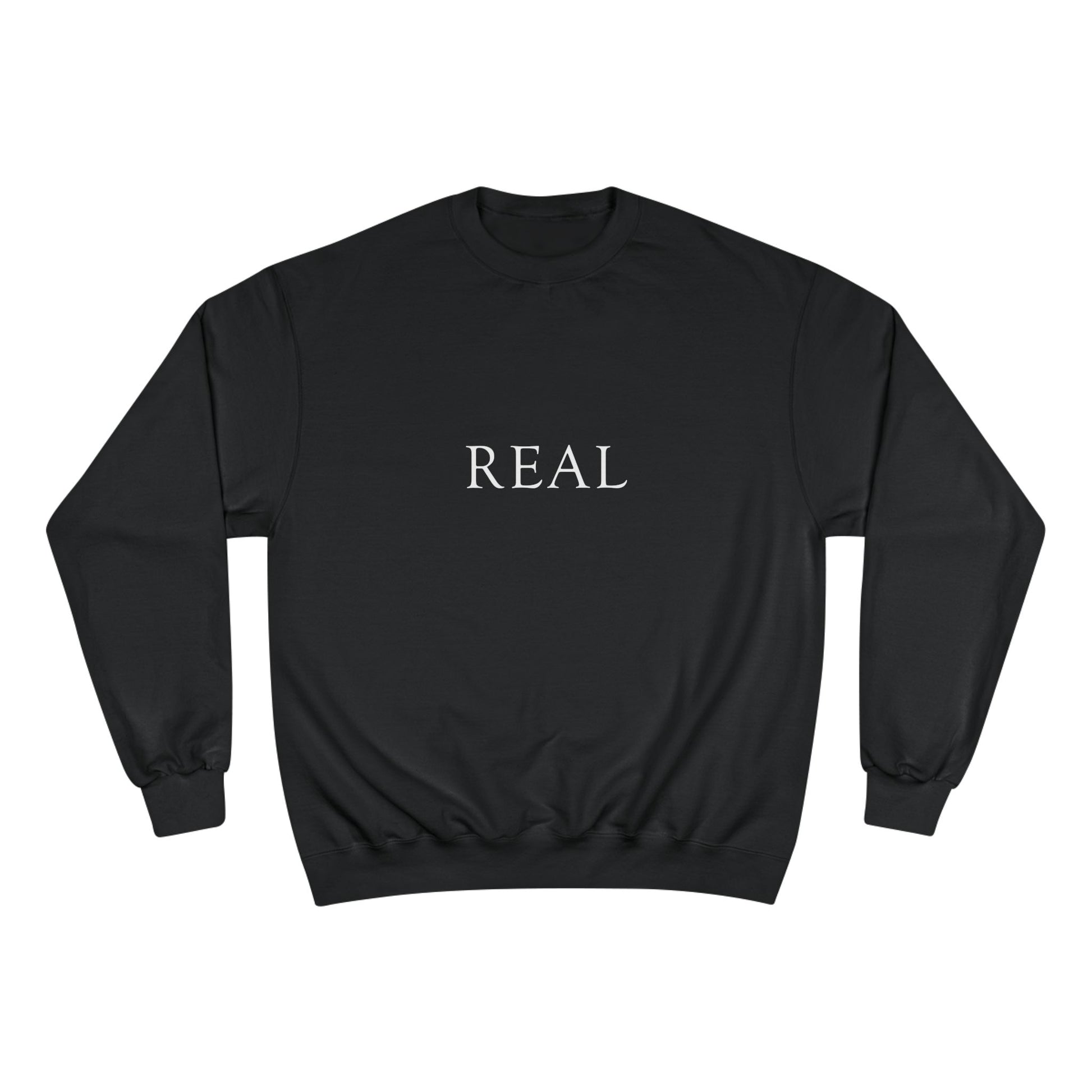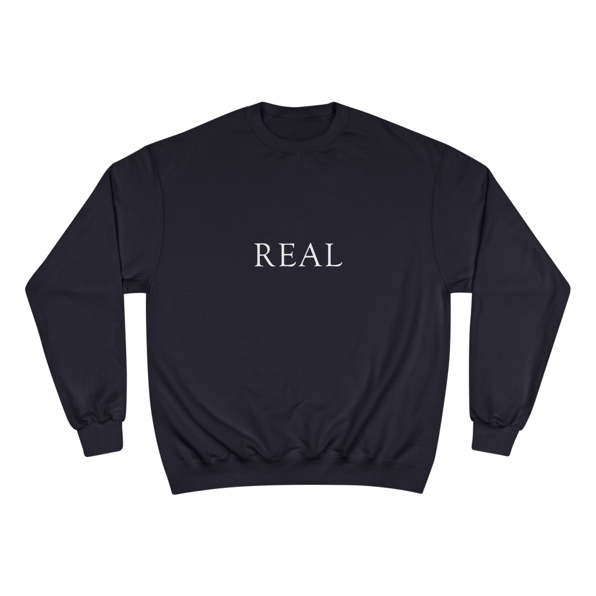 A midweight crewneck that reads calm and confident. Soft yet structured, this sweater carries a simple, serif “REAL” across the chest for a low-key statement. It sits neatly at the waist with ribbed cuffs and hem, and the tubular knit keeps lines clean and smooth. Wear it when you want clothes that don’t shout — just steady, quietly confident pieces that move with your day: errands, chilly coffee runs, late-night walks, or layering for travel. The subtle Champion “C” on the sleeve nods to classic sportswear heritage while the muted type keeps the look refined and wearable with jeans, tailored trousers, or a worn-in jacket.
