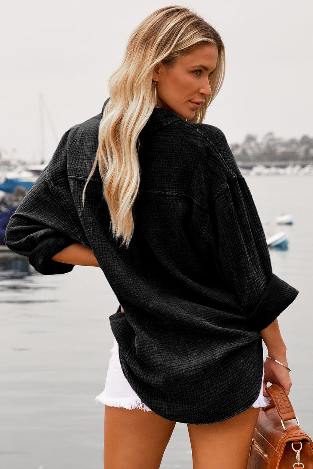 Sky Blue Mineral Wash Crinkle Textured Chest Pockets Shirt