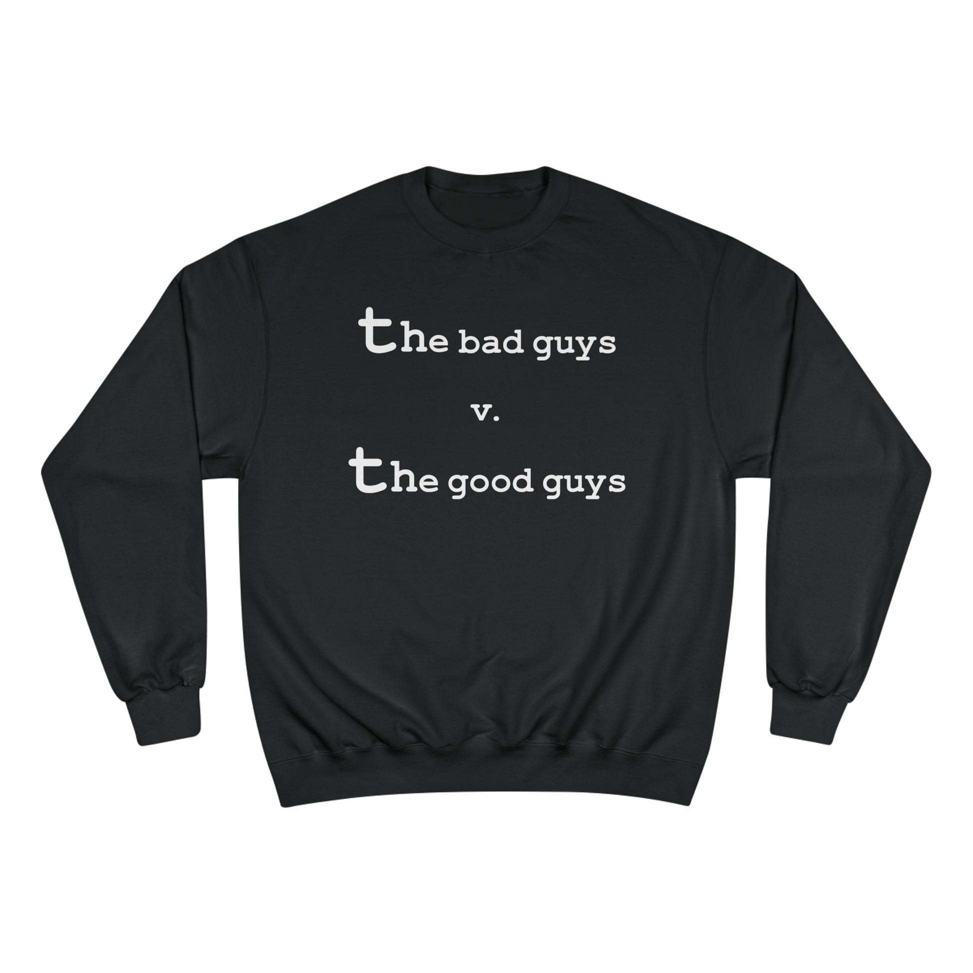 A midweight sweatshirt featuring the witty slogan "the bad guys v. the good guys" in hand-drawn lettering against a black backdrop. Crafted from a durable 50/50 cotton-poly blend, this 9 oz/yd² piece offers warmth without bulk. Ribbed knit collar, cuffs, and waistband maintain their shape through regular wear, while seamless tubular construction ensures a polished silhouette. Understated branding—a sewn-in label and small sleeve logo—keeps the aesthetic refined. Perfect for readers and thinkers who appreciate literary humor.