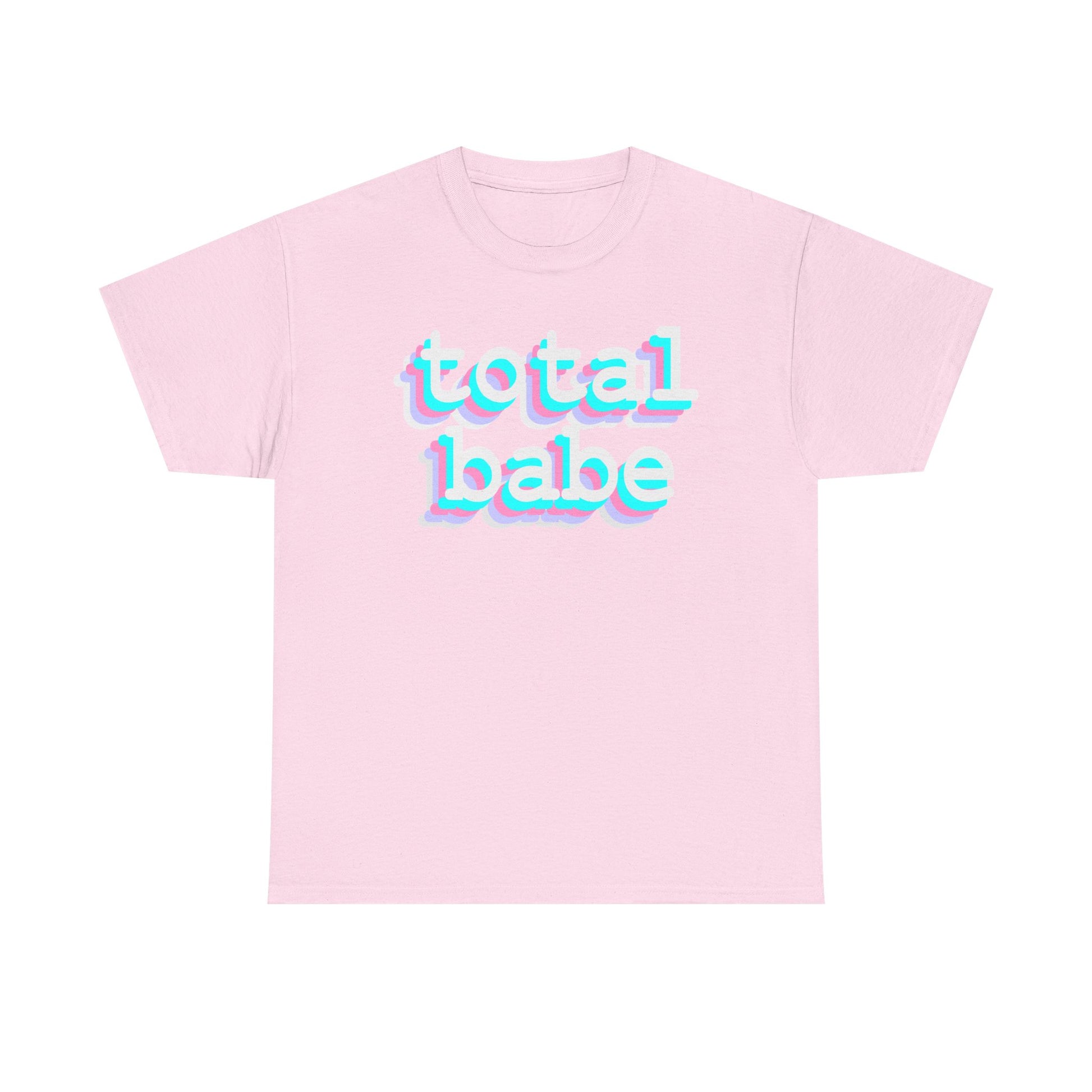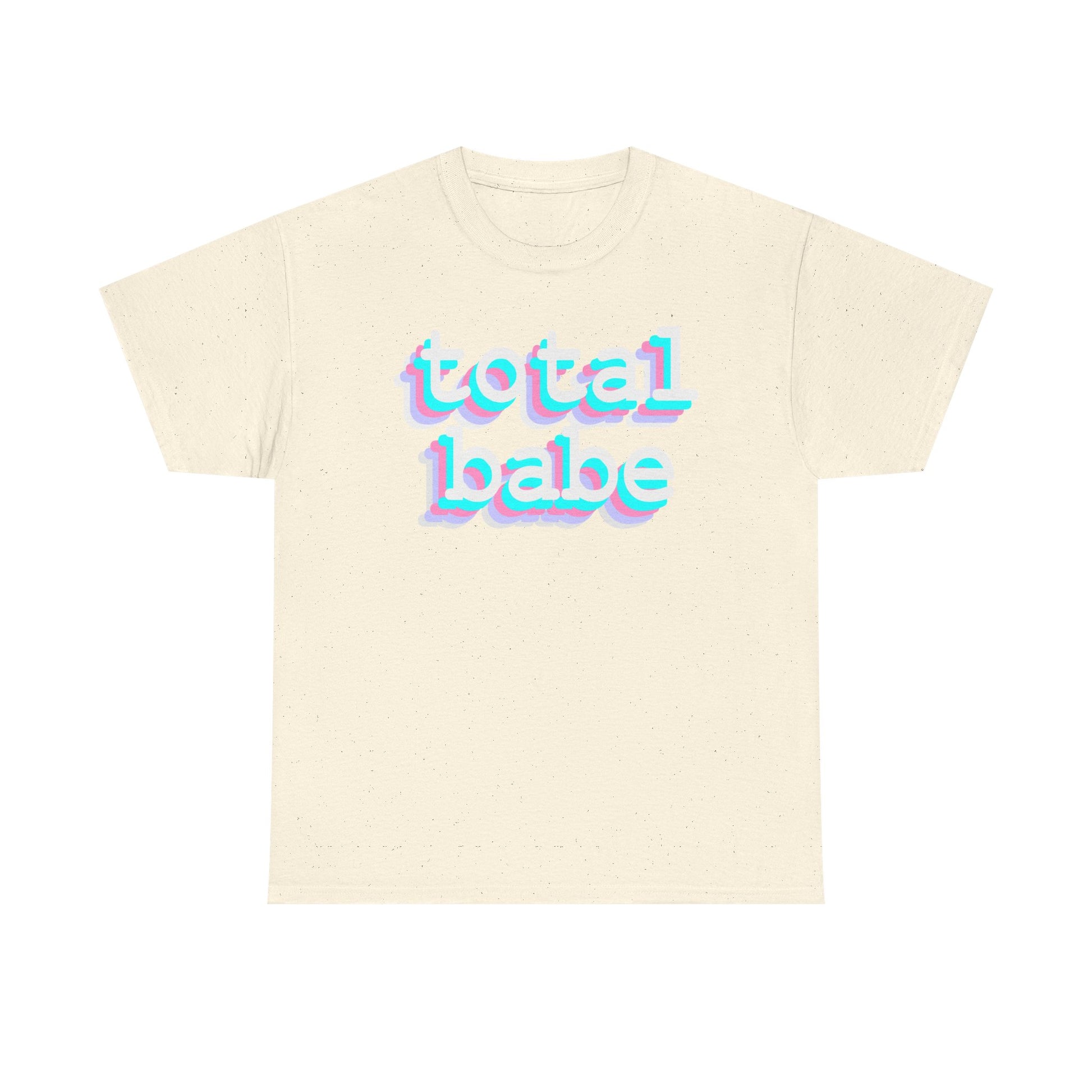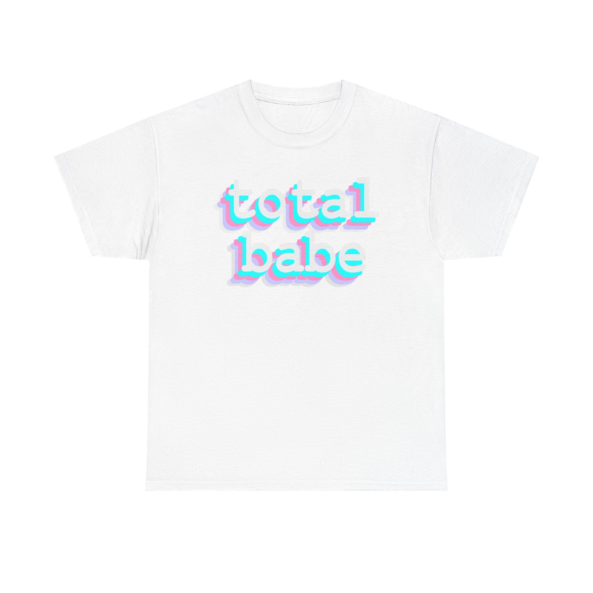 A soft, classic tee that speaks like a quiet anthem. The clean white canvas puts the iridescent “total babe” lettering front and center — a pastel, slightly retro glow that catches eyes without shouting. It feels lived-in from the first wear: stable shoulder seams, a stretchy rib collar that keeps its shape, and a relaxed crew cut that layers easily under jackets or over bralettes. The fabric is smooth and sturdy, made for prints that pop and hold through washes. Wear it on casual coffee runs, late-night drives, or low-key meetups when you want to look effortless and quietly confident.