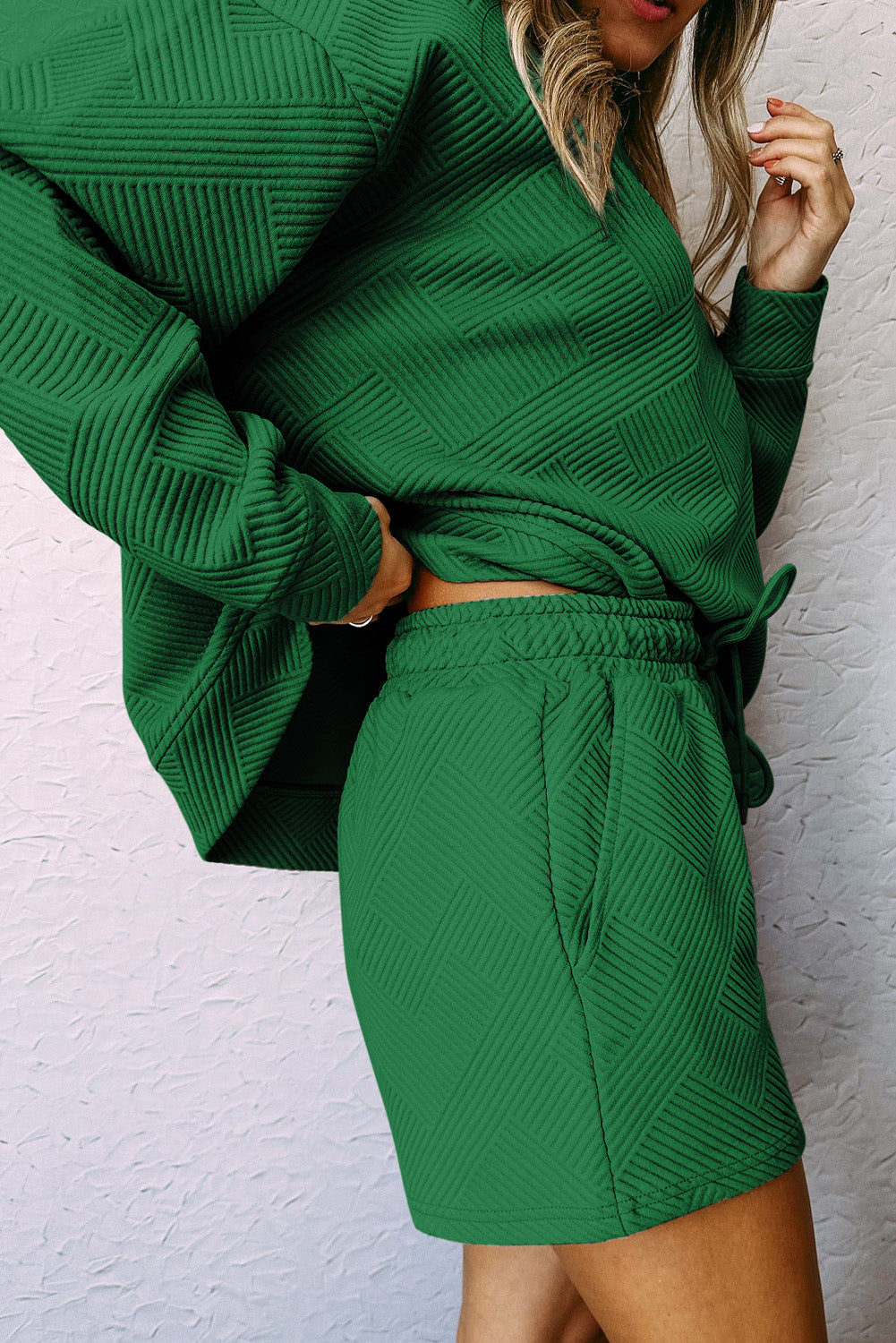 - The set features a long sleeve top and matching shorts, both made from a textured fabric in a chic color.